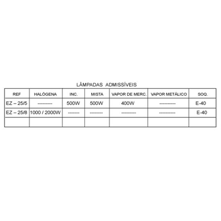 Projetor fechado, corpo refletor e aro repuxado em chapa de alumínio anodizado, pescoço em liga de alumínio fundido, visor plano de cristal temperado, soquete E-40, com regulador de foco, movimentos: horizontal e vertical