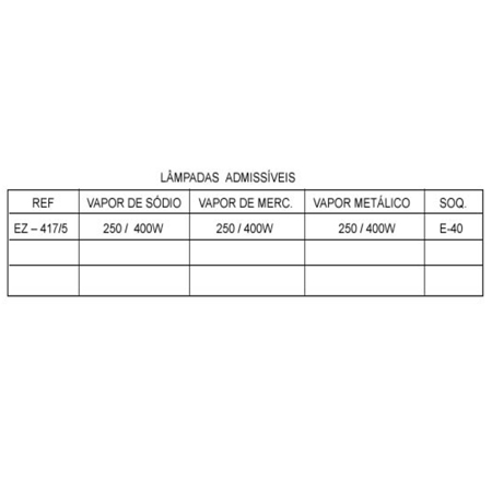Projetor fechado, corpo e aro em liga de alumínio fundido, visor plano de cristal temperado, refletor em chapa de alumínio especial, equipamento incorporado, com pintura epóxi cinza claro, soquete E-40, movimentos: horizontal e vertical.