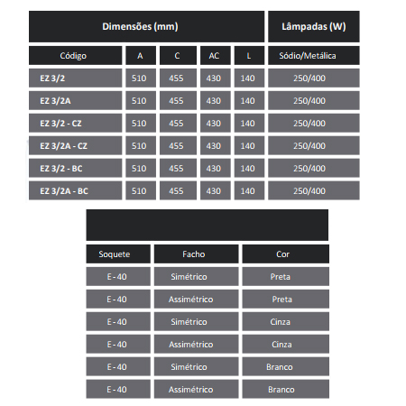 Projetor fechado, corpo em liga de alumínio injetado, refletor em chapa de alumínio, com alojamento integrado para reator, visor em vidro plano temperado incolor, suporte de fixação galvanizado a fogo. Acabamento epóxi na cor preta.