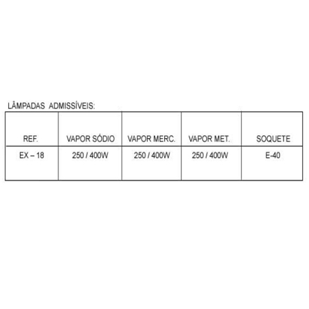 Luminária pública fechada, corpo, aro e suporte de fixação em liga de alumínio fundido, refrator prismático em policarbonato e refletor estampado em chapa de alumínio anodizado. Encaixe em ponta de braço 48 ou 60,3mm.