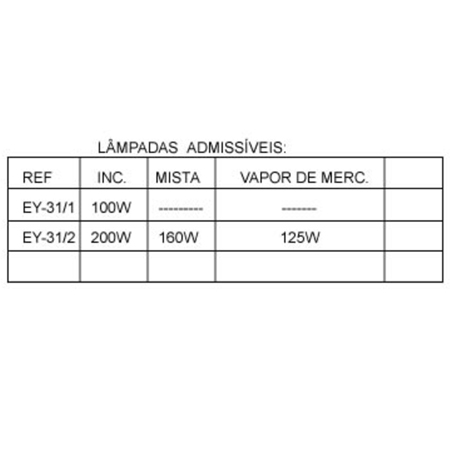 Aparelho para iluminação fabricado em liga de alumínio fundido, grade reforçada, fixação embutida, lente de vidro plano temperado, refletor interno de chapa de alumínio anodizado, soquete de porcelana, guarnição de borracha resistente ao calor e tempo.