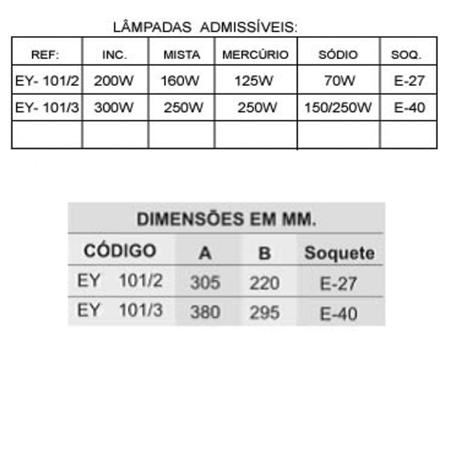 Aparelho para iluminação fabricado em liga de alumínio fundido, fixação plafonier, globo de vidro resistente a choque térmico, soquete de porcelana, vedações de borracha resistente ao calor e ao tempo.