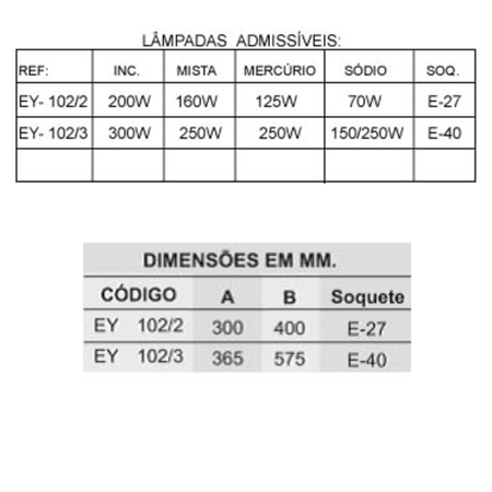 Aparelho para iluminação fabricado em liga de alumínio fundido, fixação arandela 30°, globo de vidro resistente a choque térmico, soquete de porcelana, vedações de borracha resistente ao calor e ao tempo.