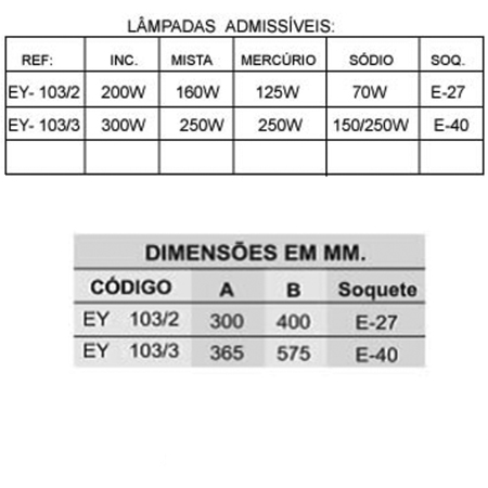 Aparelho para iluminação fabricado em liga de alumínio fundido, fixação arandela 90°, globo de vidro resistente a choque térmico, soquete de porcelana, vedações de borracha resistente ao calor e ao tempo.