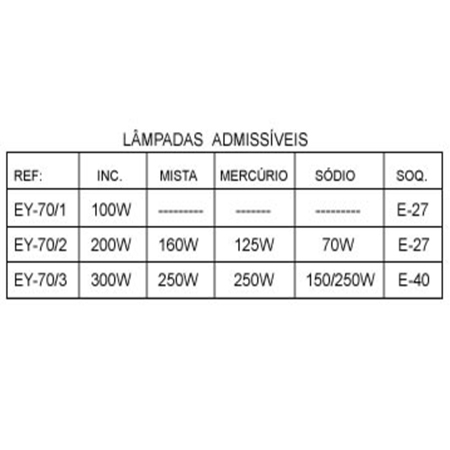Aparelho para iluminação fabricado em liga de alumínio fundido, grade reforçada, para uso portátil, globo de vidro alcalino ou boro-silicato, soquete de porcelana, vedações de borracha resistente ao calor e ao tempo.