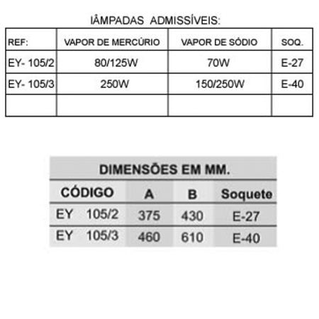 Aparelho para iluminação fabricado em liga de alumínio fundido, com alojamento para equipamento auxiliar incorporado, fixação arandela 30°, globo de vidro resistente a choque térmico, soquete de porcelana, vedações de borracha resistente ao calor e ao tempo.