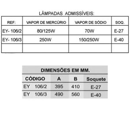Aparelho para iluminação fabricado em liga de alumínio fundido, com alojamento para equipamento auxiliar incorporado, fixação arandela 90°, globo de vidro resistente a choque térmico, soquete de porcelana, vedações de borracha resistente ao calor e ao tempo.