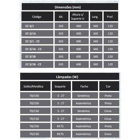 Projetor fechado, corpo em liga de alumínio injetado, refletor em chapa de alumínio, com alojamento integrado para reator, visor em vidro plano temperado incolor, suporte de fixação galvanizado a fogo.