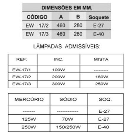 Aparelho para iluminação fabricado em liga de alumínio fundido, fixação arandela 90°, refrator de vidro prismático resistente a choques térmicos, soquete de porcelana reforçado.