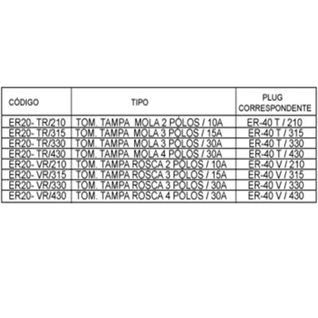 Tomadas e plugs para 10,15 E 30 A, até 4 polos e 380V. Caixa e tampa fundidos em liga de alumínio, tampa de mola ou rosqueada.
