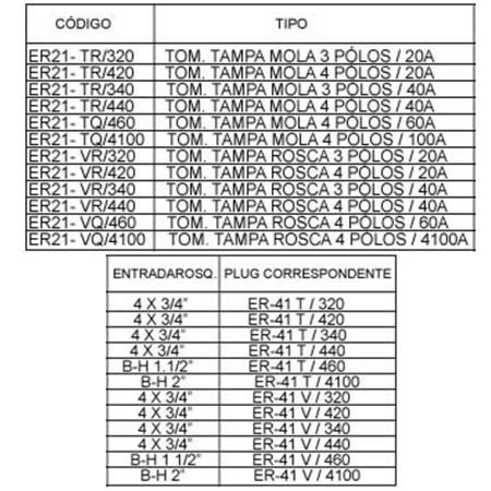 Tomadas e plugs para 20A até 100A até 4 polos e 500V. Caixas redondas até 40A, ou retangulares para 60A a 100A, fundidas em liga de alumínio. Tampa de mola ou rosqueada.