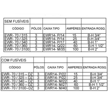 Chave rotativa tipo \\\"pacco\\\" tripolar para serviço pesado, ligamento e desligamento rápido à plena carga. Comando externo através de alavanca frontal. Disponível de 15A a 100A - 500V, com ou sem fusíveis tipo diazed (Retardado).